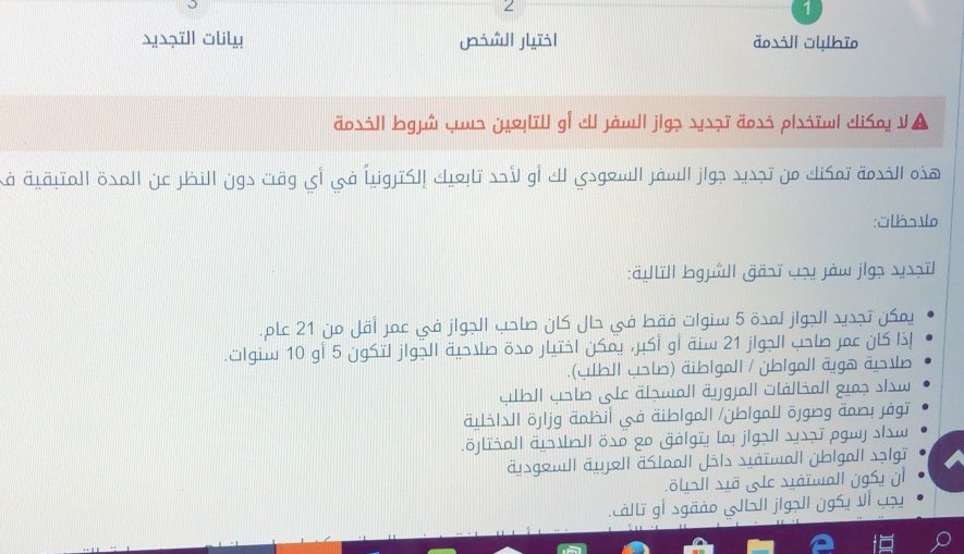 لا يمكنك استخدام خدمة تجديد جواز السفر لك أو للتابعين حسب شروط الخدمة